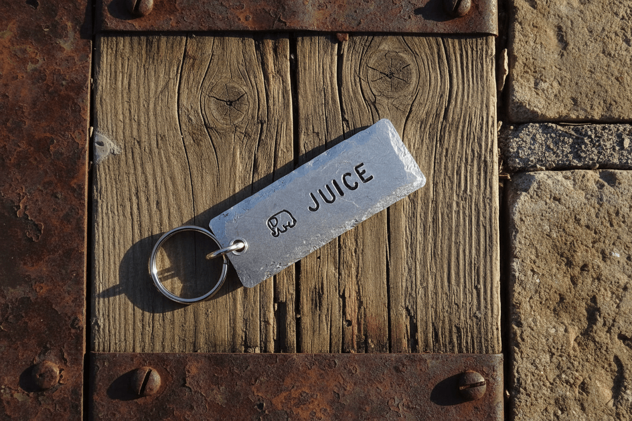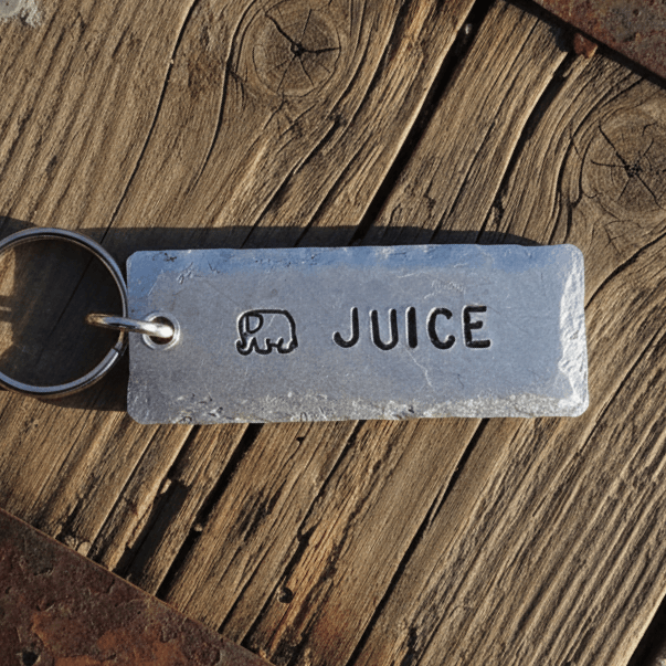 A Completely Handmade, Hand stamped Keyring reading - ELEPHANT JUICE