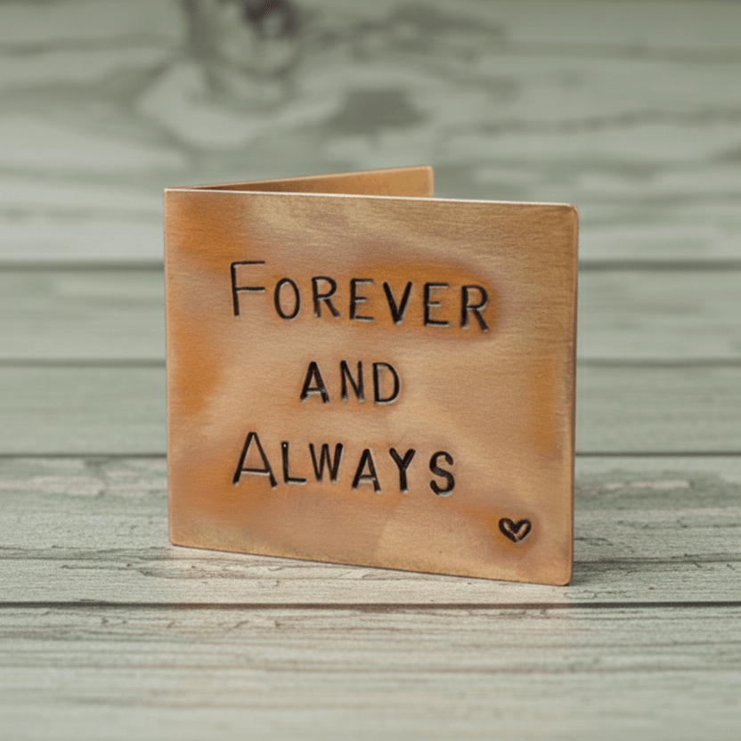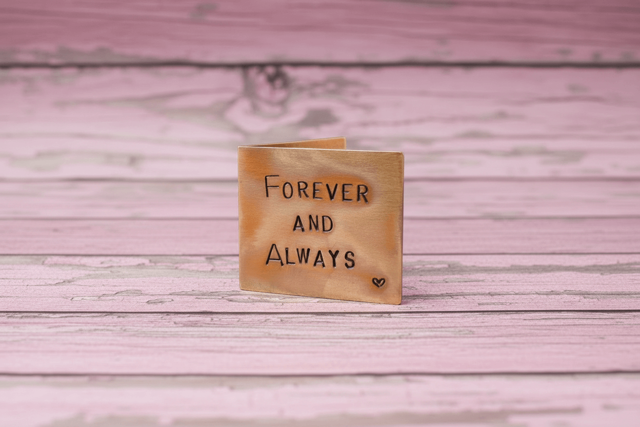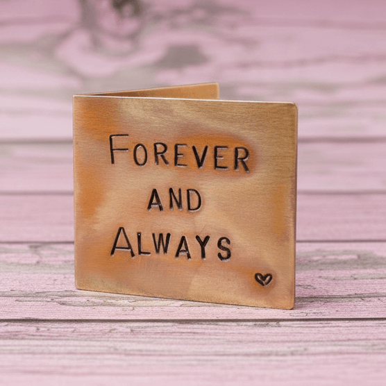 The front reads "FOREVER AND ALWAYS" And inside we will stamp your special Message. This could be your wedding date or your anniversary date, Anything you like ●MAXIMUM 20 CHARACTERS●