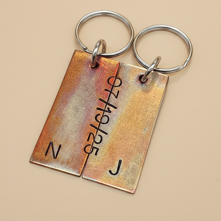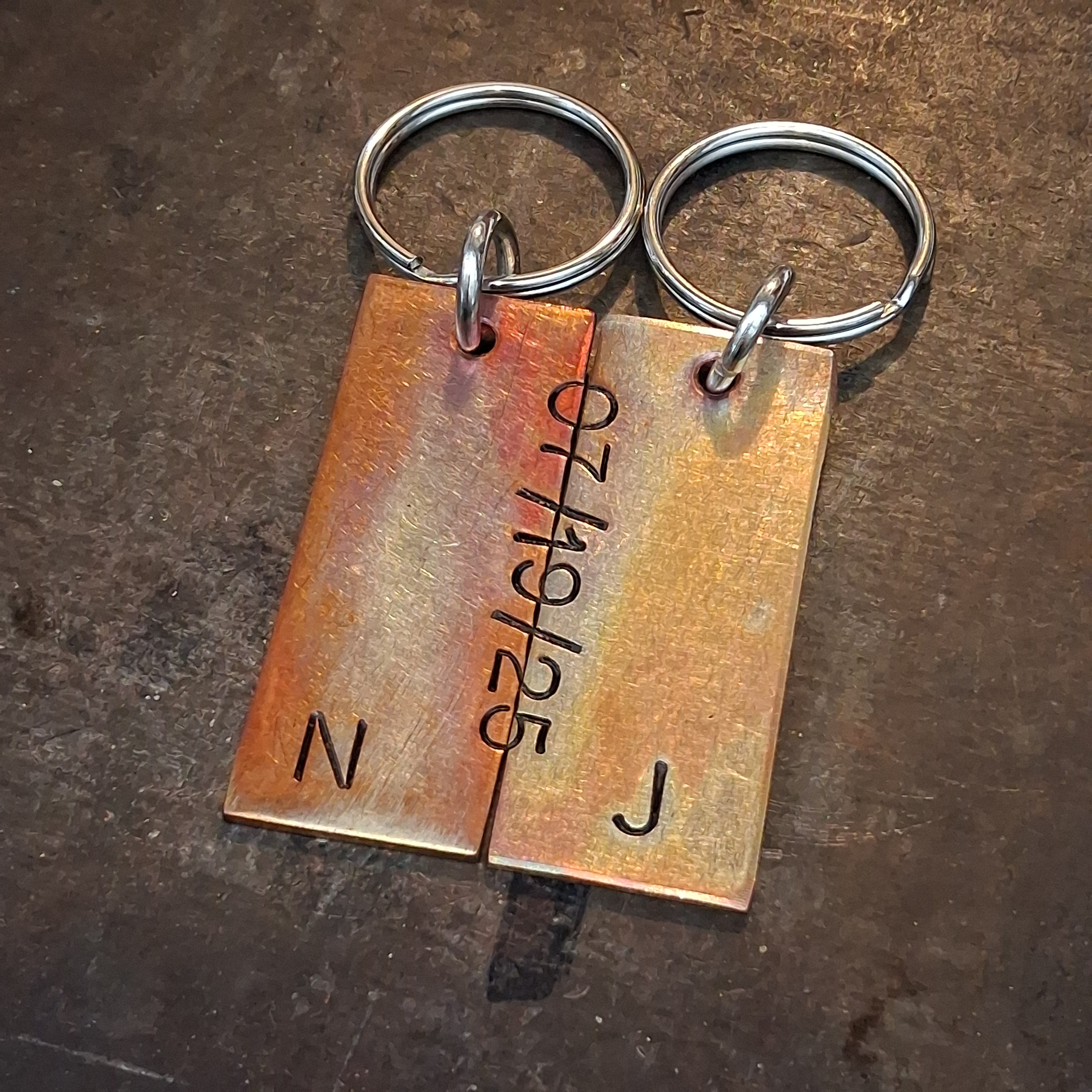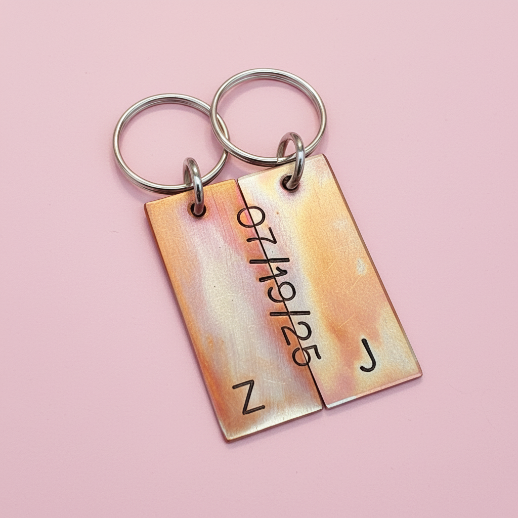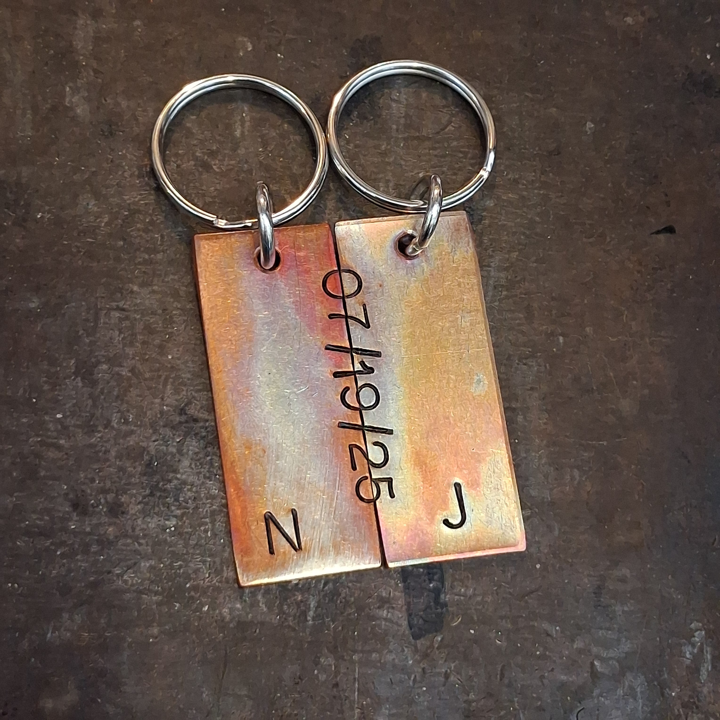 Personalized pair of Handcrafted Keychains reading "Your special date" and your initials.