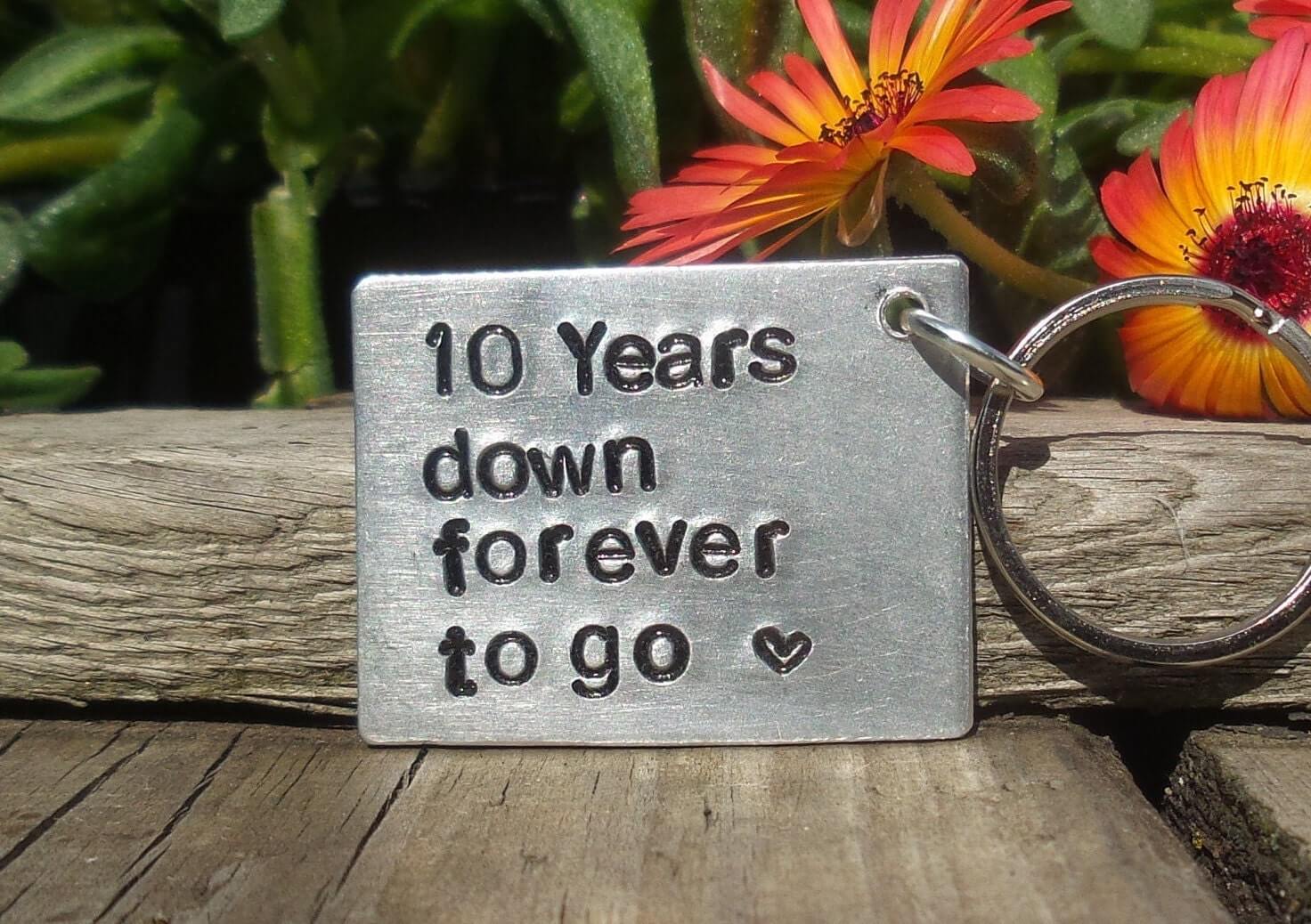 A Completely Handmade Hand stamped Keyring reading - 10 YEARS DOWN. FOREVER TO GO.