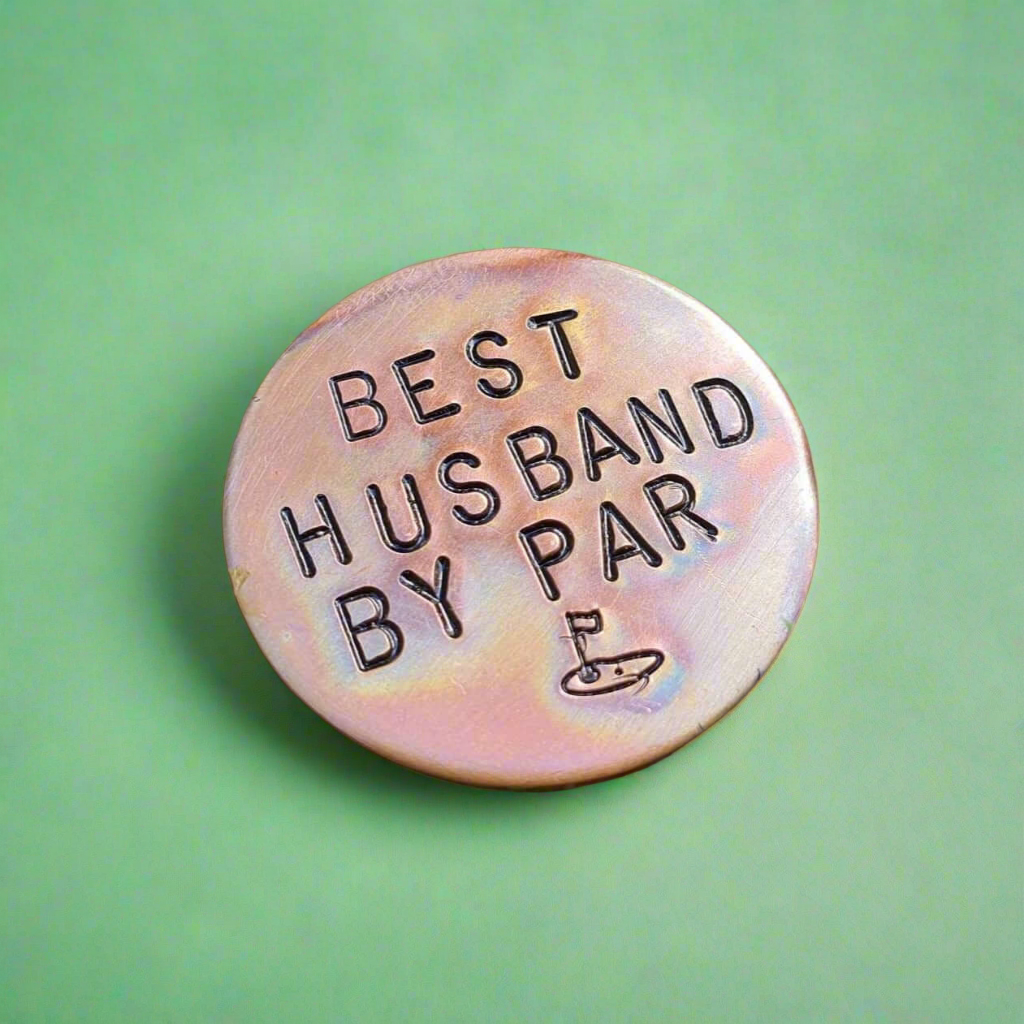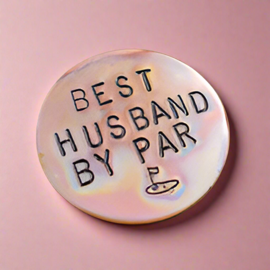 Handmade golf ball marker reading..