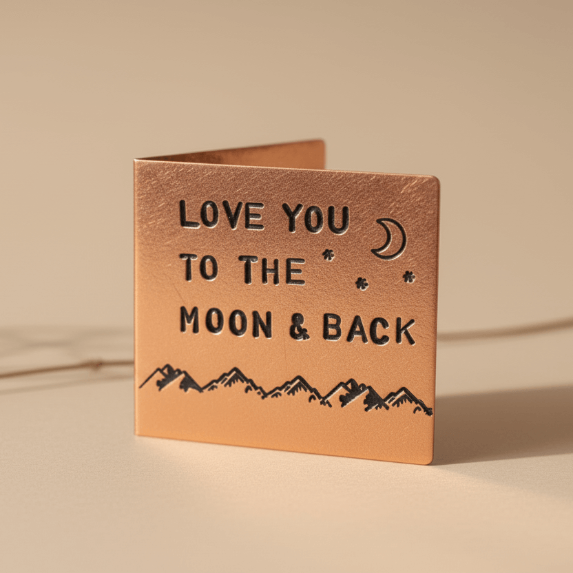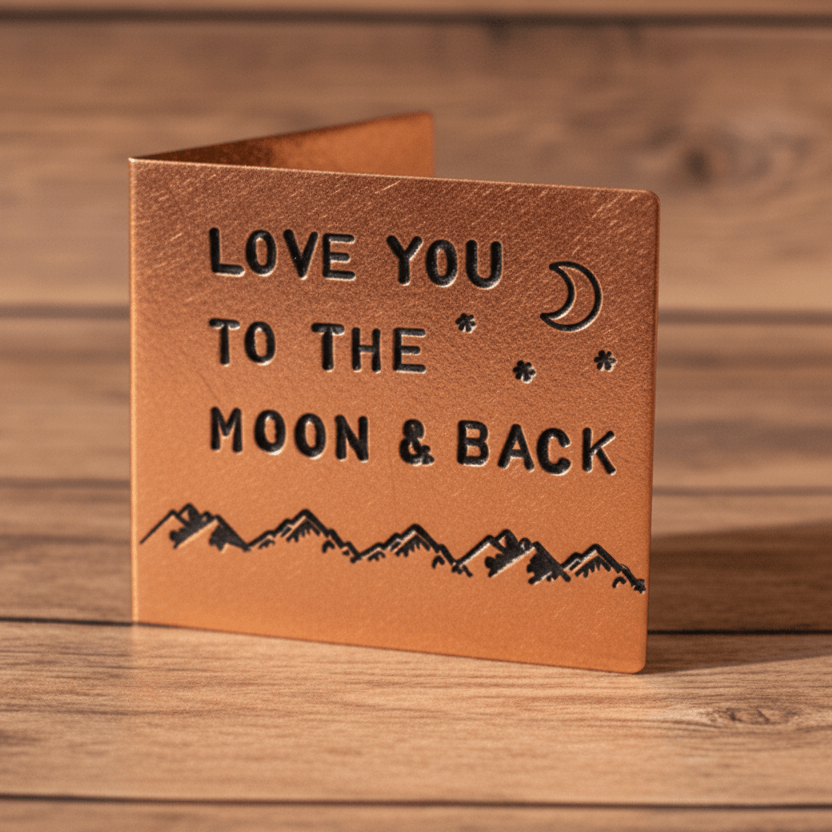 Celebrate your love with our METAL Anniversary Card, featuring "I Love You To The Moon And Back" and personalized with your special date.