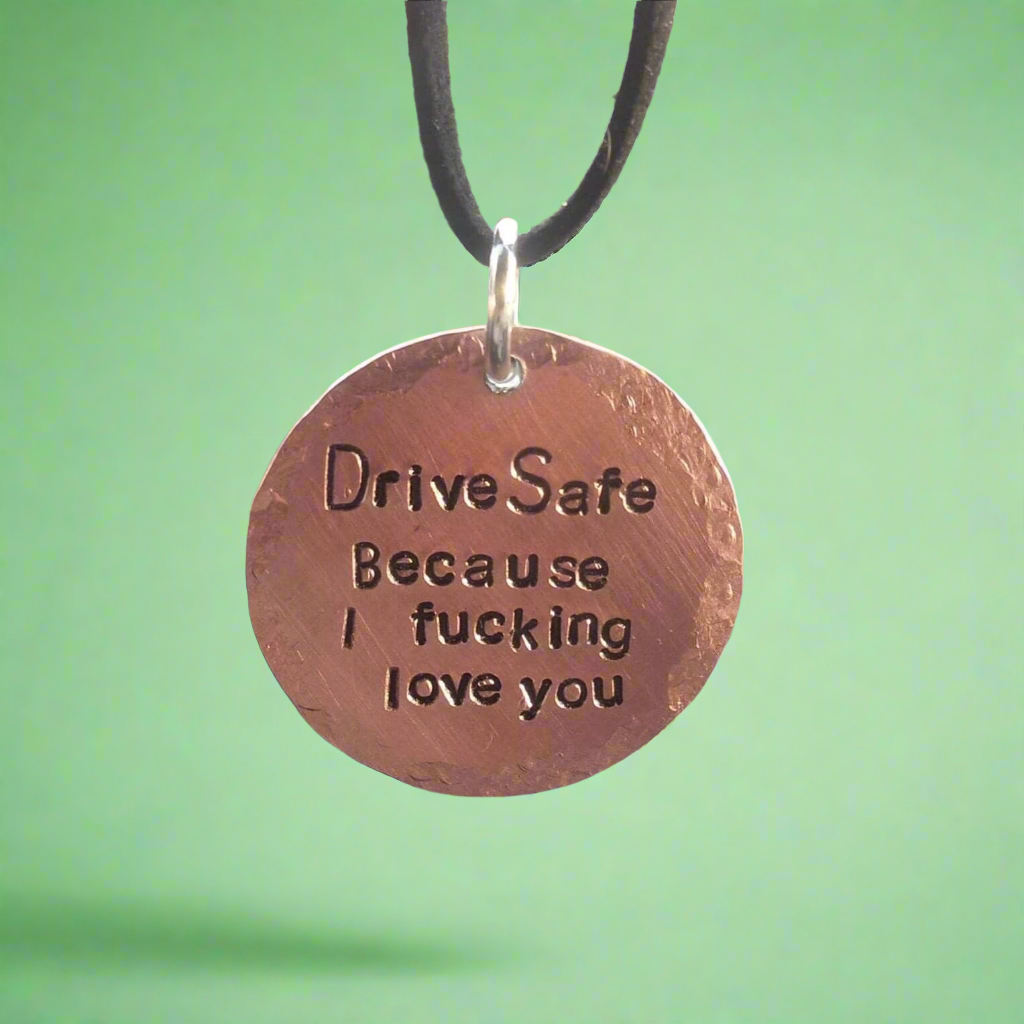 Handmade copper REAR VIEW MIRROR CHARM reading drive safe because I fucking love you