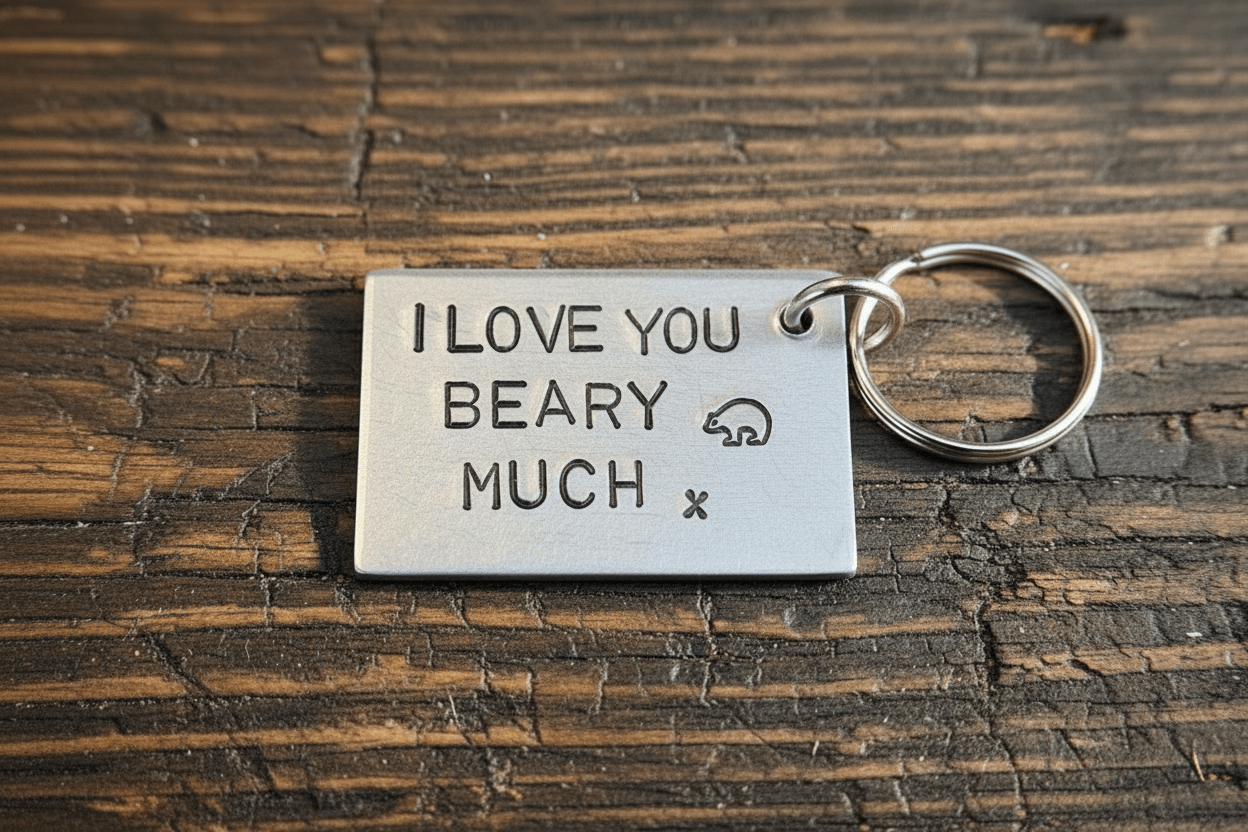 These keyrings are handmade in our studio. Each one is hand stamped and completely unique.