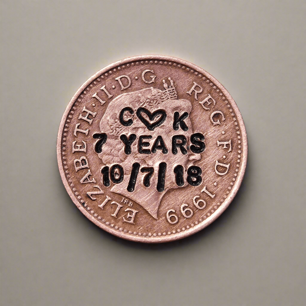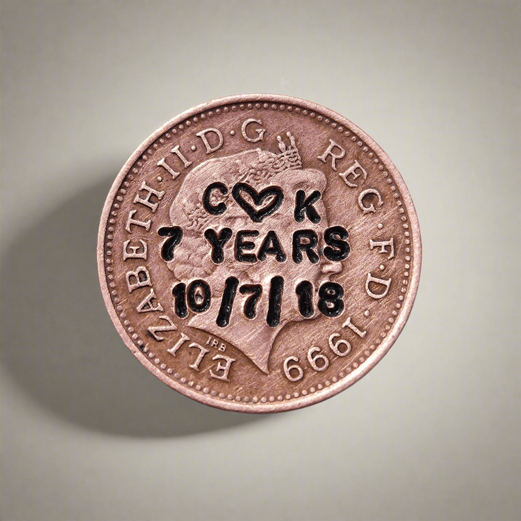 This British penny will arrive with your very own INITIALS "7 Years " and your DATE.